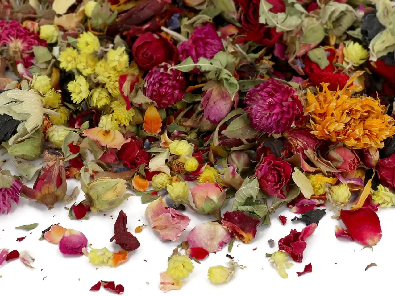 Körömvirág, rózsabimbó, vörös lóhere virág, gránátalma virág, citromos verbéna, homoki szalmavirág.