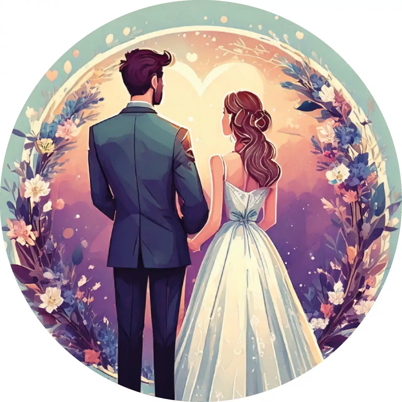 Nyomtatás ostyára vagy fondant papírra / cukorlapra Esküvői pár kerek (lila-zöld) 20cm