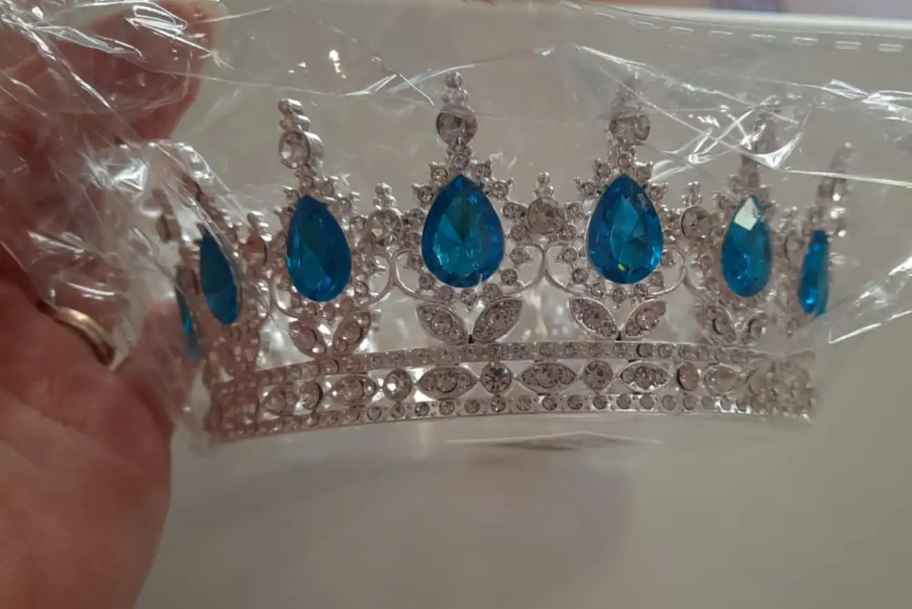 kék kővel díszített ezüst színű korona dísz