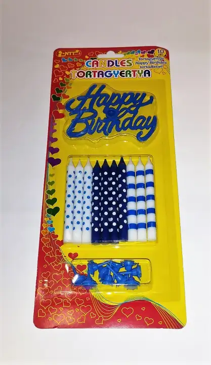 10 darabos kék színű szülinapi tortagyertya szett, Happy Birthday feliratos díszítő beszúróval.