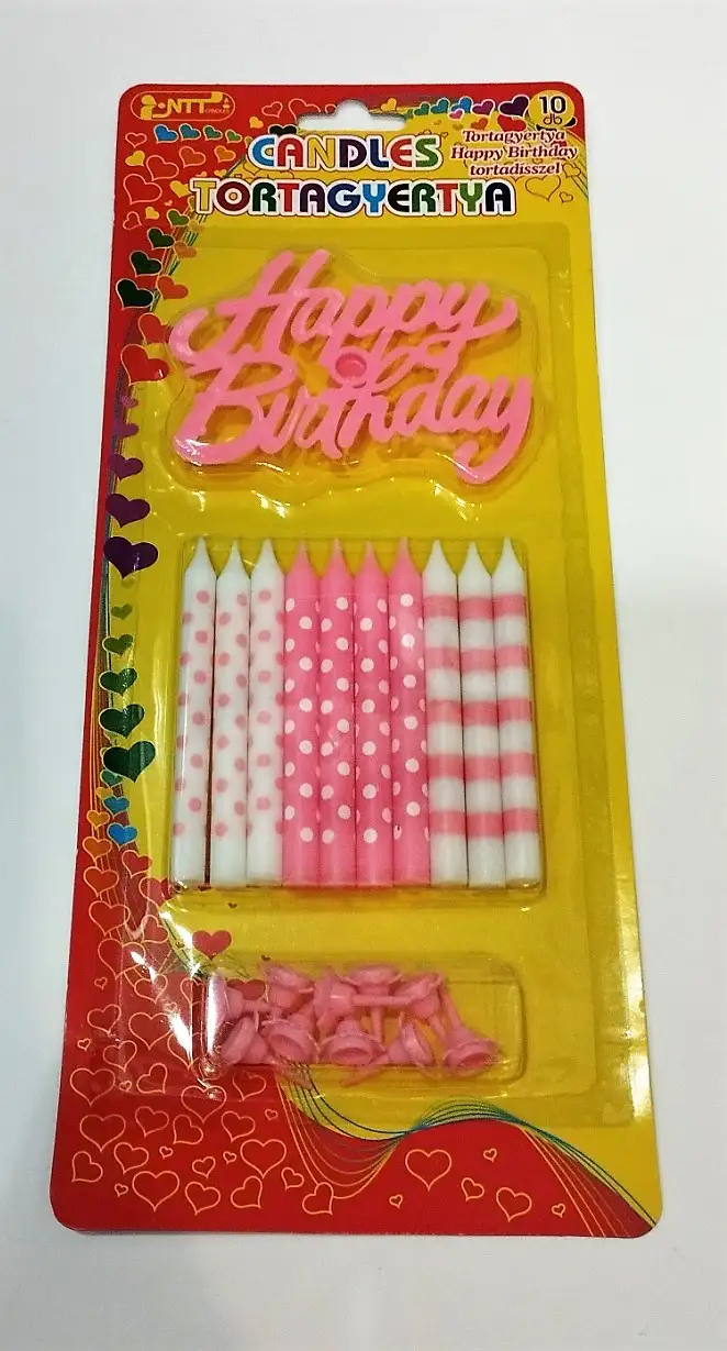 10db-os rózsaszín szülinapi gyertya, Happy Birthday feliratos beszúróval.
